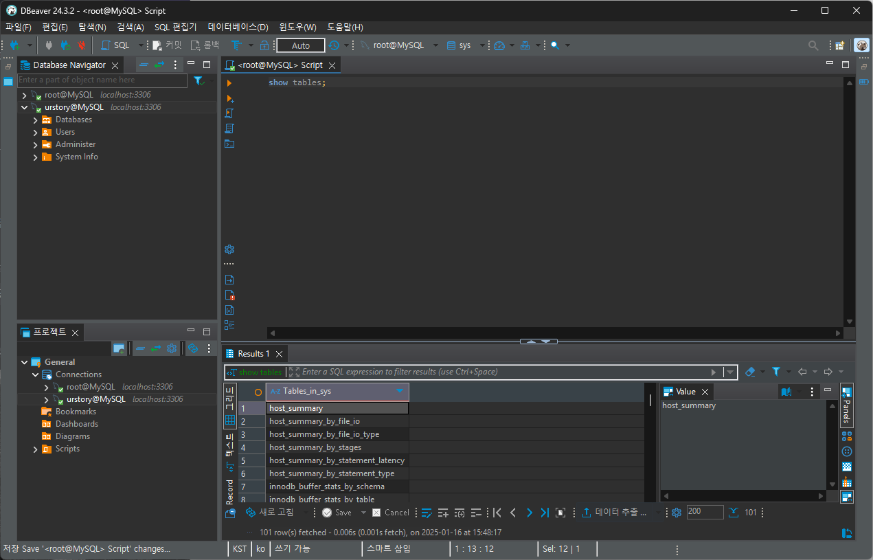 데이터베이스 별로 테이블을 조회할 수 있다.