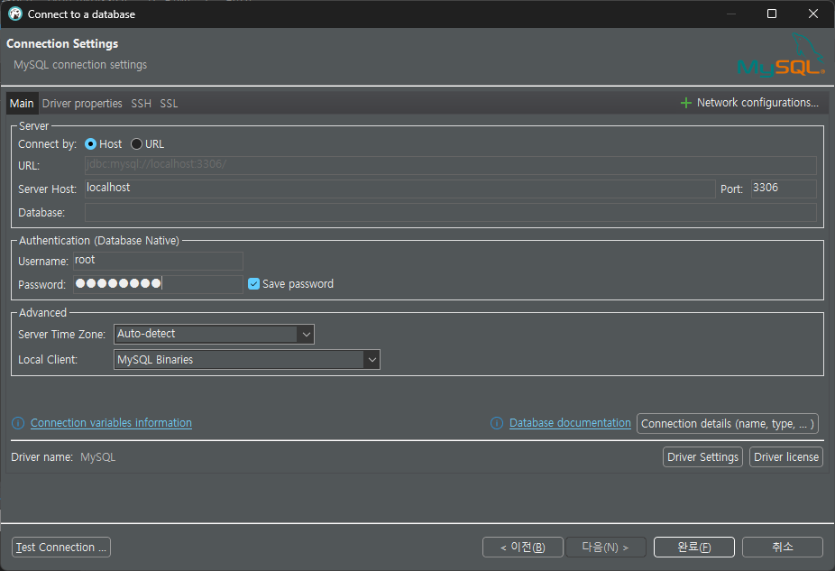 이때, 'Test Connection...'을 누르면 Connection error가 뜨는데,