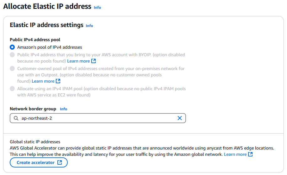 - Network border group을 ap-northeast-2(Seoul)로 지정하고, Elastic IP 주소를 생성한다.