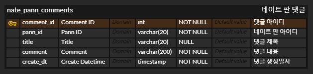 ) engine=innodb default charset=utf8 comment='네이트 판 댓글';