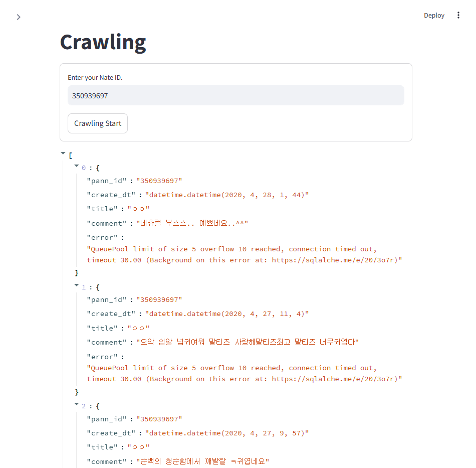 하지만 QueuePool Limit으로 인해서 에러가 발생한 것을 알 수 있다. 이는 추후 해결 방법을 알아볼 예정이다.