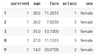 df_tmp = df[['survived', 'age', 'fare', 'pclass', 'sex']]