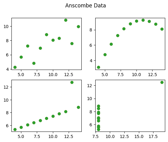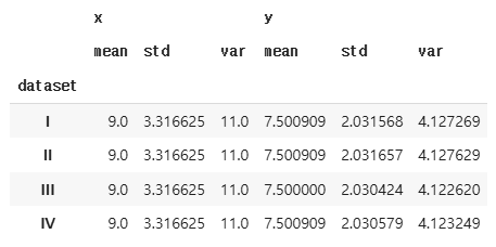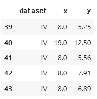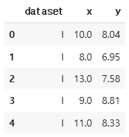 df_anscombe['dataset'].unique()				# array(['I', 'II', 'III', 'IV'], dtype=object)