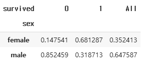 pd.crosstab(index=df['sex'], columns=df['survived'], margins=True, normalize="index")