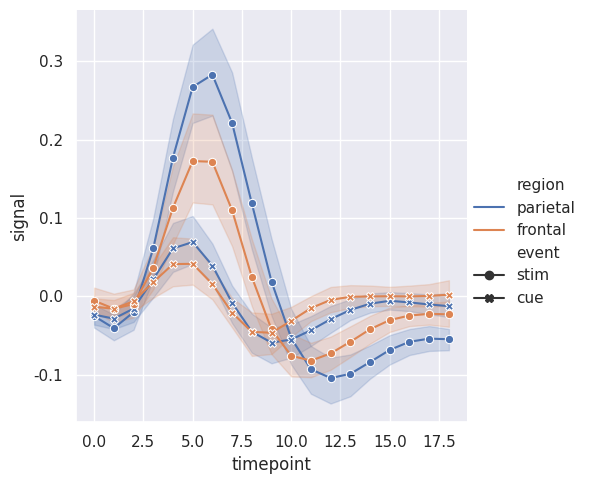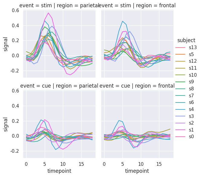 hue="subject", col="region", row="event", height=3, estimator=None)