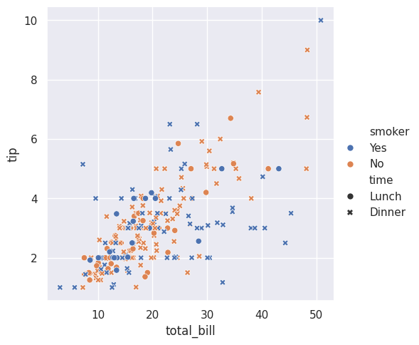 sns.replot(data=tips, x="total_bill", y="tip", hue="smoker", style="time")