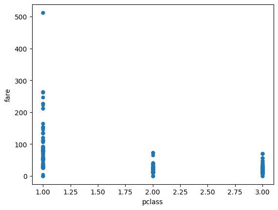 df_number.plot(kind='scatter', x='pclass', y='fare')
