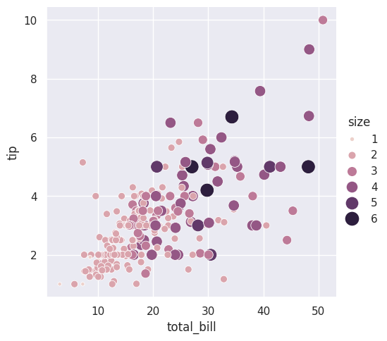 sns.replot(data=tips, x="total_bill", y="tip", hue="size", size="size", sizes=(15, 200))