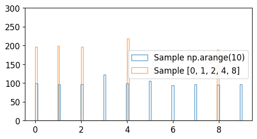 plt.hist(a, bins=100, density=False, alpha=0.75, histtype='step', label='Sample np.arange(10)')