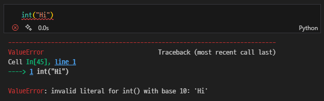 Value Error는 부적절한 데이터를 가진 인자를 받았을 때 발생하는 에러이다.