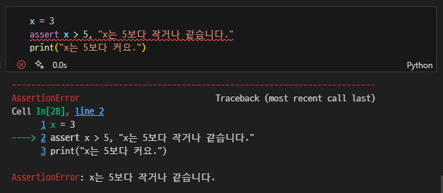 assert는 조건이 False일 때, 오류 메시지를 출력한다.