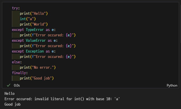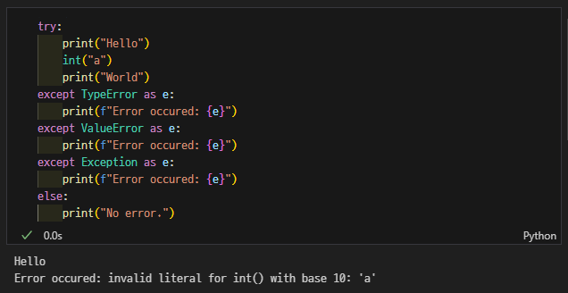 except문은 여러 개 작성할 수 있다. 이때, except문은 if문처럼 작동하기 때문에 범위가 좁은 에러부터 작성해야 한다.