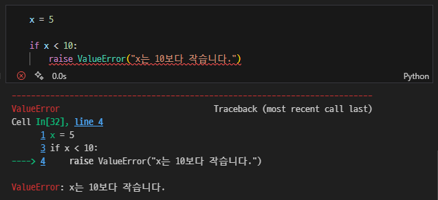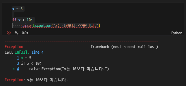 raise는 예외를 강제로 발생시킬 때 사용한다. 이때, raise 뒤에는 발생시키고 싶은 예외 이름을 작성한다.